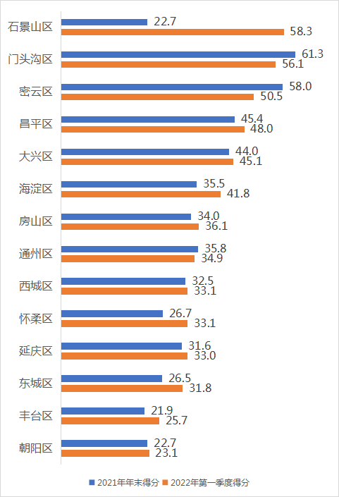 14個(gè)區(qū)的得分有所增長(zhǎng),其中石景山區(qū)增幅最大,得益于1月以來(lái)石景山區(qū)為迎接2022年冬奧會(huì)、冬殘奧會(huì),區(qū)城管委推進(jìn)的監(jiān)督管理智能化、推進(jìn)引導(dǎo)宣傳精細(xì)化、推進(jìn)社會(huì)參與常態(tài)化等舉措。