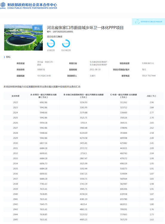 另據(jù)財政部PPP中心網(wǎng)站公開資料顯示,合作期內(nèi),蔚縣城鄉(xiāng)環(huán)衛(wèi)一體化PPP項目財政承受能力論證測算的財政支出責(zé)任需從預(yù)算中安排的支出責(zé)任匯總總額162549.35萬元。