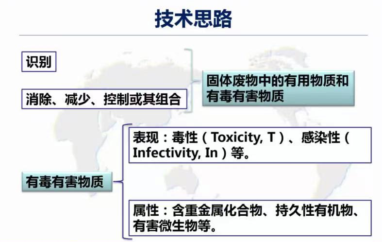 固廢管理的技術(shù)思路分為兩類,一方面應(yīng)識(shí)別固廢中的有用物質(zhì)對(duì)其進(jìn)行資源化利用;而另一方面對(duì)表現(xiàn)出毒性、感染性等含重金屬化合物、持久性有機(jī)物和有害微生物等有毒有害物質(zhì)需著力消除、減少、控制或使用組合措施。廢物處理中通常需要加入能量與化學(xué)物質(zhì),在轉(zhuǎn)化得到產(chǎn)品的同時(shí)可能產(chǎn)生大氣排放、水體排放與工藝殘余物,需要關(guān)注與控制。