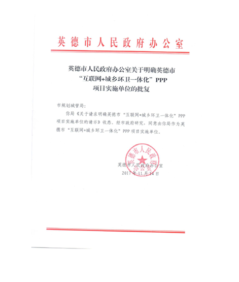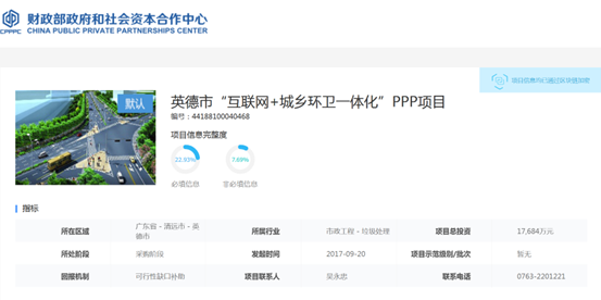 另據(jù)財政部政府和社會資本合作中心PPP項目管理庫公開信息顯示,英德市“互聯(lián)網(wǎng)+城鄉(xiāng)環(huán)衛(wèi)一體化”PPP項目發(fā)起時間2017年9月,所處階段為采購階段,回報機制為可行性缺口補助。