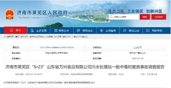 并且前幾天,山東省濟南市萊蕪區(qū)公布了“6?23”山東省萬興食品有限公司污水處理站一般中毒和窒息事故調查報告。