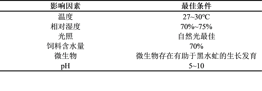(1)溫度:黑水虻幼蟲的最適生長發(fā)育溫度是27~30℃。低于26℃成蟲不產卵,而溫度過高會導致幼蟲停止攝食。