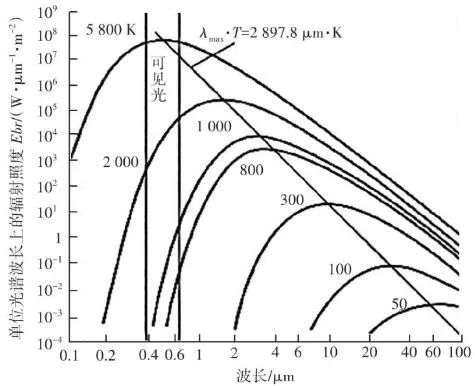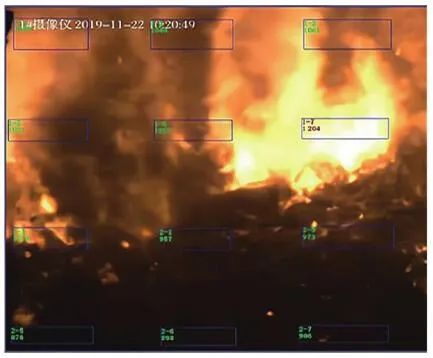 根據(jù)普朗克(Plank)黑體輻射定律,自然界的任何物體只要溫度高于絕對(duì)零度(-273.15 ℃),就會(huì)以電磁輻射的形式在非常寬的波長(zhǎng)范圍內(nèi)發(fā)射能量,產(chǎn)生電磁波(輻射能)。不同的材料、溫度、表面光度及顏色,發(fā)出的紅外輻射強(qiáng)度都不同,大氣電磁光譜示意見(jiàn)圖4。普朗克輻射定律給出了黑體輻射的具體譜分布,在一定溫度下,單位面積的黑體在單位時(shí)間、單位立體角內(nèi)和單位波長(zhǎng)間隔內(nèi)輻射出的能量見(jiàn)公式(1):式中:B(λ,T)為黑體的光譜輻射亮度(W?m-2?Sr-1?μm-1);T為黑體的絕對(duì)溫度(K);c為光速,c=2.998×108 m/s;h為普朗克常數(shù),h=6.626×10-34 J?s;K為波爾茲曼常數(shù),K=1.380×10-23 J/K。在一定溫度下,黑體的光譜輻射亮度存在一個(gè)極值,這個(gè)極值的位置與溫度有關(guān),這就是維恩位移定律(Wien):式中:λmax為最大黑體光譜輻射亮度處的波長(zhǎng)(μm);T為黑體的絕對(duì)溫度(K);b為維恩常量,b=0.002 897 m·K(2.897×103μm·K)。根據(jù)Wien定律,我們可以估算,當(dāng)T=6 000 K時(shí),λmax為0.48 μm(綠色),這就是太陽(yáng)輻射中大致的最大光譜輻射亮度處。當(dāng)T=300 K,λmax=9.6 μm,這就是地球物體輻射中大致最大光譜輻射亮度處。普朗克定律描述的黑體輻射在不同溫度下的頻譜見(jiàn)圖5。根據(jù)圖5中數(shù)據(jù),可以得到如下結(jié)論:隨著溫度升高,輻射能量增加,這是紅外輻射理論的出發(fā)點(diǎn),也是單波段紅外測(cè)溫設(shè)計(jì)的依據(jù)。隨著溫度升高,輻射峰值波長(zhǎng)向短波方向移動(dòng),其規(guī)律符合Wien定律,即λmax?T=2 897.8 μm?K。這個(gè)公式解釋了為什么“高溫測(cè)溫儀”多采用短波,“低溫測(cè)溫儀”多采用長(zhǎng)波。輻射能量隨溫度的變化率,短波比長(zhǎng)波大,即短波處工作的“測(cè)溫儀”相對(duì)信噪比高,抗干擾性強(qiáng)。由Wien定律可以得出,溫度越高,輻射峰值的波長(zhǎng)越短。所以為了使輻射接收器有一個(gè)較理想的信噪比,對(duì)于溫度越低的物體,可測(cè)量的輻射波長(zhǎng)越長(zhǎng)。近年來(lái),利用光電轉(zhuǎn)換元件(Charge Coupled Device,CCD),即“電荷耦合元件”測(cè)量和監(jiān)測(cè)火焰溫度的方法受到越來(lái)越多的關(guān)注,國(guó)內(nèi)外先后開(kāi)展了大量研究。CCD用于將鏡頭收集到的光信號(hào)轉(zhuǎn)變?yōu)殡娦盘?hào)從而進(jìn)行進(jìn)一步處理。日本因其先進(jìn)的電子技術(shù)及對(duì)環(huán)保的強(qiáng)烈意識(shí),最先在燃燒診斷中應(yīng)用了數(shù)字圖像處理技術(shù)。法國(guó)的Renier等通過(guò)CCD相機(jī)獲得物體表面圖像,隨后通過(guò)黑體爐標(biāo)定并利用輻射定律來(lái)得到輻射物體表面參數(shù),同時(shí)他們將濾光片加在CCD相機(jī)前來(lái)提高系統(tǒng)的靈敏性并擴(kuò)大測(cè)溫范圍。我國(guó)生活垃圾焚燒火焰產(chǎn)生的固體顆粒物主要為炭黑顆粒和飛灰,火焰面內(nèi)部固體顆粒為炭黑顆粒,而飛灰主要彌散在火焰面外部。炭黑顆粒相較于飛灰具有更小的結(jié)構(gòu)尺寸,意味著其擁有更大的比表面積,即更大的輻射表面積,進(jìn)而擁有更強(qiáng)的發(fā)射輻射能力。因此生活垃圾焚燒火焰連續(xù)光譜強(qiáng)度主要由其中的炭黑顆粒主導(dǎo)。生活垃圾焚燒后氣體產(chǎn)物如H2O、CO2、CO、NO等物質(zhì)的發(fā)射光譜多分布在近紫外和遠(yuǎn)紅外區(qū)域,而在λ為0.5~0.9 μm波段上很少有發(fā)射光譜存在,對(duì)于本系統(tǒng)的測(cè)溫效果幾乎沒(méi)有干擾。因此,在λ=0.5~0.9 μm波段上炭黑顆??杀徽J(rèn)為是火焰發(fā)射輻射的主導(dǎo)者,進(jìn)而將生活垃圾焚燒火焰輻射特性的研究轉(zhuǎn)變?yōu)槠渲刑亢陬w粒輻射特性的研究。而垃圾焚燒爐內(nèi)測(cè)量區(qū)域的火焰及煙氣溫度基本在700~1 200 ℃,對(duì)應(yīng)的黑體絕對(duì)溫度在973~1 473 K(圖5),此溫度下黑體輻射最強(qiáng)的波段集中在短波區(qū)域,因此為適應(yīng)垃圾焚燒爐的特性需要采取短波高溫?zé)岢上駜x。綜上所述,最終本系統(tǒng)選取的CCD響應(yīng)光譜范圍在0.4~1.0 μm,其中0.4~0.8 μm為可見(jiàn)光圖像, 0.8~1.0 μm的近紅外光用于測(cè)溫。對(duì)于垃圾焚燒來(lái)說(shuō),在0.4~1.0 μm波長(zhǎng)區(qū)間主要存在的化學(xué)發(fā)光來(lái)自于Na、K、Rb等堿金屬的特征譜線(xiàn),而這些譜線(xiàn)的波長(zhǎng)大都≤0.8 μm,所以對(duì)用于測(cè)溫的0.8~1.0 μm波段影響較小。針對(duì)垃圾焚燒應(yīng)用環(huán)境存在爐溫波動(dòng)大、閾值范圍廣的現(xiàn)象,可以通過(guò)軟件對(duì)爐內(nèi)溫度閾值進(jìn)行設(shè)置,實(shí)現(xiàn)超溫報(bào)警、低溫報(bào)警,以實(shí)現(xiàn)當(dāng)爐內(nèi)局部的“熱點(diǎn)”溫度過(guò)高或者局部爐溫降低時(shí),分別通過(guò)降風(fēng)、減料和增風(fēng)、加料等操作來(lái)改善爐內(nèi)工況。某項(xiàng)目單臺(tái)750 t/d焚燒爐紅外成像畫(huà)面見(jiàn)圖6。因紅外探頭由焚燒爐后拱俯視爐內(nèi),所呈現(xiàn)的畫(huà)面并非為整體的火焰鋒面,而是分散的柱狀火焰。同區(qū)域火焰亮度、高度有明顯差異。相比爐膛火焰監(jiān)視器呈現(xiàn)的豎直火焰鋒面在縱向深度上有更為廣泛的視角跨度。圖6 紅外熱成像系統(tǒng)顯示畫(huà)面圖6中所示藍(l