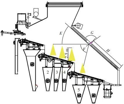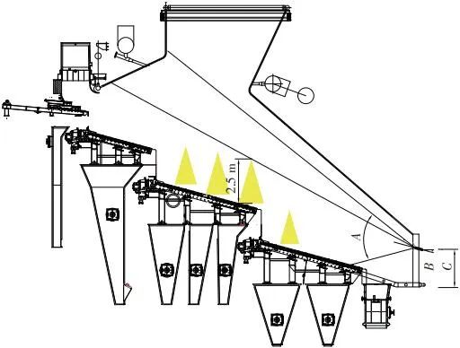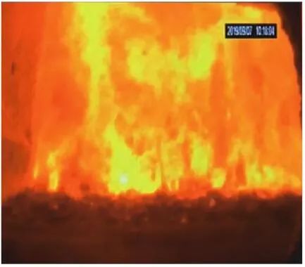 當(dāng)前生活垃圾焚燒爐廣泛采用的爐膛火焰監(jiān)視系統(tǒng)基本上都是由早期應(yīng)用在水泥廠(chǎng)、鋼鐵廠(chǎng)的加熱爐、退火爐和氧化鋁廠(chǎng)等行業(yè)內(nèi)的高溫看火工業(yè)電視演變升級(jí)而來(lái)。內(nèi)窺式數(shù)字高清爐膛火焰監(jiān)視系統(tǒng)成像裝置主要由耐高溫針孔電動(dòng)鏡頭、寶石物鏡、光學(xué)濾光片、光圈焦距調(diào)節(jié)器等組成,配有電控推進(jìn)器、氣源控制柜、光端機(jī)等輔助設(shè)備。其核心問(wèn)題是如何在生活垃圾焚燒爐的高溫、多塵、強(qiáng)腐蝕環(huán)境中長(zhǎng)周期穩(wěn)定運(yùn)行,保證火焰畫(huà)面不丟包、不失真。1)優(yōu)勢(shì)特性分析。一是技術(shù)成熟、運(yùn)行穩(wěn)定。隨著我國(guó)近一二十年間生活垃圾發(fā)電廠(chǎng)的興建,爐膛火焰監(jiān)視系統(tǒng)的技術(shù)也處于不停地優(yōu)化和迭代之中,目前已能滿(mǎn)足穩(wěn)定、可靠的要求。其中常規(guī)配置參數(shù)為攝像頭300 萬(wàn)像素,響應(yīng)時(shí)間2 s,光圈(F數(shù))1.6,焦距2.4 mm。二是工作環(huán)境好。爐膛火焰監(jiān)視器探頭通常安裝于焚燒爐后墻,所處位置是垃圾燃燒最末端,常規(guī)工況下探頭周?chē)鸁煔鉁囟韧ǔ?lt;600 ℃。較之焚燒爐其他高溫環(huán)境已算“宜居地帶”。三是維護(hù)量小。焚燒爐后墻幾乎沒(méi)有結(jié)焦現(xiàn)象,常規(guī)爐膛火焰監(jiān)視探頭開(kāi)孔位置僅存有因爐膛偶爾正壓時(shí)煙氣外冒造成的積灰,積灰量不大,清理工作較為輕松。2)劣勢(shì)特性分析。一是參數(shù)單一。因垃圾焚燒行業(yè)爐型構(gòu)造和燃燒成分的特殊性,垃圾焚燒爐長(zhǎng)期采用的火焰探頭利用的是光學(xué)成像原理,運(yùn)行人員僅能通過(guò)觀察火焰形狀和位置來(lái)判斷焚燒爐工況,無(wú)法得到多維度參數(shù)。二是視角局限。爐膛火焰探頭通常位于焚燒爐后墻,安裝角度朝向爐內(nèi)成斜向上方向,與水平線(xiàn)夾角15°左右,探頭視場(chǎng)角通常>60°。以某大型列動(dòng)順推爐排焚燒爐為例,在此仰視角度下可以看到爐排燃燒段尾部、燃燼段前部?jī)擅婷黠@的火焰幕墻,由于火焰鋒面遮擋,很難觀察到燃燒段中前部的火焰狀況。 以某單臺(tái)750 t/d大型列動(dòng)順推爐排焚燒爐中爐膛火焰監(jiān)視器安裝位置和顯示畫(huà)面為實(shí)例,具體分析火焰成像狀態(tài)。其實(shí)際火焰成像畫(huà)面見(jiàn)圖1。成像角度是由焚燒爐后墻探頭位置向上仰視爐膛。因焚燒工況十分良好,靠近后墻的燃燼段區(qū)域幾乎沒(méi)有明火,燃燒段尾部成一面豎直、光亮的黃紅色火焰鋒面,高度約為2.5 m。對(duì)應(yīng)的爐膛火焰監(jiān)視器安裝示意如圖2所示。爐膛火焰探頭安裝在焚燒爐后墻,安裝位置與后墻觀火平臺(tái)地面距離為C(m)。開(kāi)孔傾角與水平方向夾角為B(°),有效視場(chǎng)角為A(°)。圖2中由黃色填充的三角形區(qū)域代表正常燃燒火焰,其中標(biāo)注高度2.5 m的區(qū)域?yàn)槿紵隣t排尾部火焰,即為圖1所顯示的火焰鋒面。顯然,從爐膛火焰監(jiān)視器向上望去,燃燒段前部、中部火焰為視野盲區(qū)。由于被燃燒段尾部火焰鋒面遮擋,通過(guò)火焰監(jiān)視器通常只能看到燃燒段尾部、燃燼段前部這兩個(gè)區(qū)域的火焰。