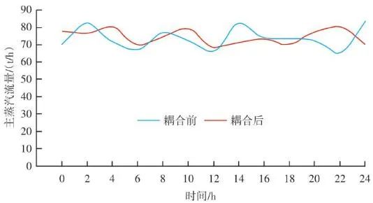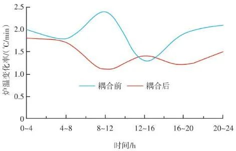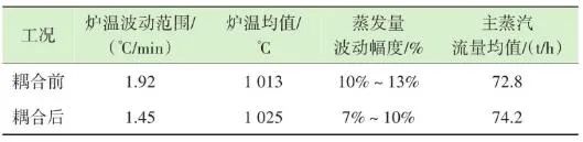 生活垃圾焚燒爐的排放物在滿(mǎn)足GB 18485—2014 生活垃圾焚燒污染控制標(biāo)準(zhǔn)的前提下,為保障焚燒爐的長(zhǎng)期安全運(yùn)行、汽機(jī)系統(tǒng)的穩(wěn)定高效運(yùn)轉(zhuǎn),通常通過(guò)爐溫和主蒸汽流量這兩個(gè)因素來(lái)判斷鍋爐運(yùn)行是否良好。以下工況為某項(xiàng)目單臺(tái)750 t/d生活垃圾焚燒爐在紅外熱成像管理系統(tǒng)應(yīng)用前、應(yīng)用后兩段時(shí)期的實(shí)際運(yùn)行參數(shù),以此實(shí)例來(lái)解析該系統(tǒng)的運(yùn)行效果。該項(xiàng)目額定主蒸汽流量為74 t/h。如圖10所示,藍(lán)色實(shí)線(xiàn)為耦合前24 h變化率波動(dòng)范圍,紅色實(shí)線(xiàn)為耦合后24 h變化率波動(dòng)范圍。爐溫變化率指的是焚燒爐上、中、下3層共計(jì)9個(gè)溫度測(cè)點(diǎn)的熱電偶反饋溫度在每分鐘內(nèi)升高或降低的溫度值,而溫度變化率波動(dòng)范圍指的是單位時(shí)間內(nèi)溫度變化率最高值與最低值之間的溫度差,該差值越大表明爐溫波動(dòng)越大,即工況越不穩(wěn)定,波動(dòng)范圍越小表明工況越平穩(wěn)。此期間溫度也一直未低于環(huán)保部要求的最低限(850 ℃/2 s),均介于950~1 050 ℃。焚燒爐主蒸汽流量曲線(xiàn)如圖11所示,左側(cè)縱坐標(biāo)為主蒸汽流量,額定蒸發(fā)量74 t/h。圖中藍(lán)色實(shí)線(xiàn)為紅外熱成像系統(tǒng)與ACC系統(tǒng)耦合前24 h的主蒸汽流量曲線(xiàn),紅色虛線(xiàn)為紅外熱成像系統(tǒng)與ACC系統(tǒng)耦合后24 h的主蒸汽流量曲線(xiàn)。表1中參數(shù)可以計(jì)算出耦合前后焚燒爐爐溫波動(dòng)范圍相對(duì)縮減了24.5%,焚燒爐爐溫均值提高了1.2%,蒸發(fā)量波動(dòng)幅度縮減了3個(gè)百分點(diǎn),主蒸汽流量提高了1.4 t/h。經(jīng)過(guò)對(duì)主要運(yùn)行參數(shù)的定量分析,可以看出結(jié)合了紅外熱成像系統(tǒng)的ACC系統(tǒng)在功能性和穩(wěn)定性上有顯著提升。表1 重要運(yùn)行參數(shù)統(tǒng)計(jì)基于目前紅外熱成像管理系統(tǒng)的功能,正在逐步進(jìn)行焚燒爐溫度場(chǎng)重構(gòu)工作,對(duì)于紅外探頭收集的大量溫度點(diǎn)實(shí)時(shí)數(shù)據(jù)進(jìn)行整合并進(jìn)行紅外溫度顯示。傳感器擁有1 440×1 080個(gè)像素,其中每個(gè)像素都有對(duì)應(yīng)的溫度值,該溫度值隨著目標(biāo)溫度的變化在800~1 600 ℃對(duì)應(yīng)變化,那么我們就可以將800~1 600 ℃這個(gè)范圍內(nèi)的溫度數(shù)據(jù)映射到顏色空間中特定的彩色序列,只要在程序中明確規(guī)定溫度和顏色之間的映射函數(shù)和映射表即可實(shí)現(xiàn)相應(yīng)的偽彩顯示,即熱像圖的形式。這樣可為運(yùn)行人員提供更為直觀、立體的參考依據(jù),待溫度場(chǎng)重構(gòu)系統(tǒng)成熟后,再與ACC系統(tǒng)進(jìn)行結(jié)合,進(jìn)一步提高全廠(chǎng)的自動(dòng)化程度。紅外熱成像管理系統(tǒng)在生活垃圾焚燒控制領(lǐng)域,與傳統(tǒng)ACC系統(tǒng)經(jīng)過(guò)合理的設(shè)計(jì)、安裝、邏輯耦合后,對(duì)焚燒自動(dòng)化有以下幾個(gè)方面的改變和提升。1)視野擴(kuò)大。改變探頭安裝位置后,成像角度由仰視變?yōu)楦┮?,拓寬了爐內(nèi)火焰視場(chǎng)角度?;鹧娉上裥螤钣伞耙幻婊饓Α?提升為“一片火?!薄T诰邆渥罨镜摹斑h(yuǎn)程看火”功能前提下,為運(yùn)行人員提供更強(qiáng)有力的參考依據(jù)。2)測(cè)溫準(zhǔn)確。紅外熱成像原理相比傳統(tǒng)光學(xué)成像原理,增加了溫度反饋功能。利用軟件管理系統(tǒng),將溫度信號(hào)解析,并與實(shí)際區(qū)域一一對(duì)應(yīng)。3)靈活性高。溫度測(cè)點(diǎn)的選定可通過(guò)管理軟件任意選擇,調(diào)試結(jié)束后仍可根據(jù)實(shí)際工況進(jìn)行設(shè)置和改變。4)耦合性強(qiáng)。紅外熱成像管理系統(tǒng)除現(xiàn)有功能外更像是一個(gè)平臺(tái),可以對(duì)現(xiàn)有溫度參數(shù)和火焰狀態(tài)的大量數(shù)據(jù)進(jìn)行進(jìn)一步提升和利用,例如正在進(jìn)行的溫度場(chǎng)成像功能優(yōu)化和升級(jí)工作。5)效益提升。紅外熱成像管理系統(tǒng)融入ACC系統(tǒng)后,對(duì)焚燒爐溫度、鍋爐主蒸汽流量的穩(wěn)定性有顯著提升。對(duì)減少運(yùn)行人員工作量、增加產(chǎn)汽量、發(fā)電量等焚燒廠(chǎng)經(jīng)濟(jì)效益方面有不同程度提升。