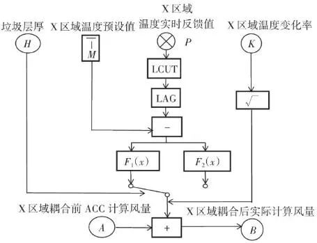 如圖9所示,X區(qū)域?qū)崟r(shí)反饋溫度經(jīng)過(guò)低切保護(hù)模塊LCUT和濾波模塊LAG后,與預(yù)設(shè)值M進(jìn)行比較,計(jì)算的差值進(jìn)入溫度-風(fēng)量折算函數(shù)F(x)。同時(shí)根據(jù)溫度上升和下降的速度變化率K,對(duì)函數(shù)的輸出速率進(jìn)行擾動(dòng),改變其響應(yīng)速度。首先X區(qū)域的理論計(jì)算風(fēng)量是耦合前原有ACC系統(tǒng)通過(guò)垃圾熱值、垃圾占比、鍋爐蒸發(fā)量、氧氣含量、鍋爐焓值等一系列參數(shù)計(jì)算出來(lái)的爐排下一次風(fēng)支管風(fēng)量,是實(shí)時(shí)變化的動(dòng)態(tài)數(shù)值,而X區(qū)域的溫度預(yù)設(shè)值M與反饋值P的差值反映的是X區(qū)域內(nèi)垃圾焚燒過(guò)于劇烈,還是處于未完全燃燒狀態(tài)。因?yàn)槔贌^(guò)程的復(fù)雜性,可以做出以下關(guān)系函數(shù):一方面在爐內(nèi)垃圾層厚度等于或大于理論的標(biāo)準(zhǔn)厚度前提下,當(dāng)X區(qū)域溫度M大于P則風(fēng)量減少,當(dāng)X區(qū)域溫度M小于P則風(fēng)量增加,當(dāng)X區(qū)域溫度M等于P則保持原有ACC計(jì)算風(fēng)量不變,此時(shí)選擇公式F1(x)內(nèi)部函數(shù);另一方面在爐內(nèi)垃圾層厚度小于標(biāo)準(zhǔn)厚度前提下,此時(shí)判斷料層過(guò)薄,風(fēng)量太大容易出現(xiàn)燒空、燒斷料的情況,因此當(dāng)M與P的差值為正數(shù)或負(fù)數(shù)時(shí)都會(huì)適當(dāng)減少風(fēng)量,但根據(jù)溫度的高或低對(duì)應(yīng)減少風(fēng)量的幅度會(huì)不同,此時(shí)利用F2(x)內(nèi)部函數(shù)。12個(gè)溫度劃分區(qū)域都基于此耦合邏輯,具體設(shè)定參數(shù)適時(shí)調(diào)整。通過(guò)干擾獨(dú)立配風(fēng)的風(fēng)量,達(dá)到改變整個(gè)焚燒爐一次風(fēng)風(fēng)量的效果。- 判斷標(biāo)準(zhǔn)及運(yùn)行效果