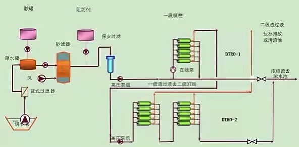 垃圾堆上滲下的滲濾液首先抽到調(diào)節(jié)池,然后從調(diào)節(jié)池抽到藍式過濾器將飛蟲等過濾,之后進入原水罐,原水罐里面自動添加硫酸調(diào)節(jié)酸堿度,此時硫酸和原水反應(yīng)過程中會生成硫化氫氣體。原水進水泵將調(diào)節(jié)好的原水經(jīng)高壓泵打到膜柱過濾,產(chǎn)生的清水進入清水罐,經(jīng)過大流量濾芯吸附氨氮、硫化物等后,再經(jīng)離交罐(又名樹脂罐)二次吸附氨氮、硫化物,然后排放至清水池,由水處理站排放。同時將吸附過濾后剩下的濃縮液打到濃水罐,用濃水泵抽到垃圾堆上,重新滲下循環(huán)處理。