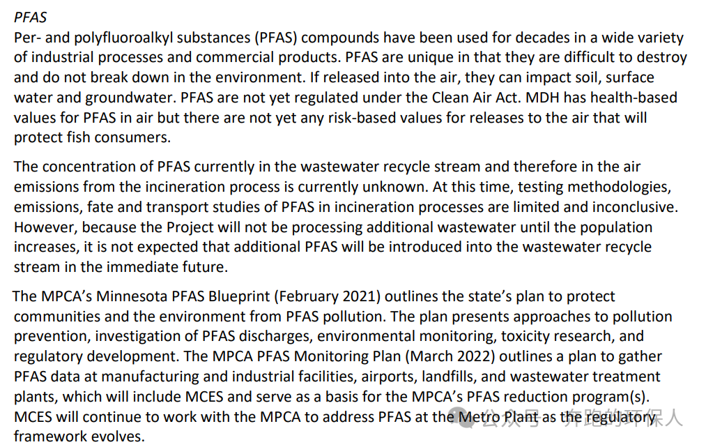 明尼蘇達(dá)污泥焚燒項(xiàng)目四期的環(huán)境評(píng)估表中可以發(fā)現(xiàn),美國(guó)對(duì)污泥焚燒中PFAS(全氟和多氟烷基物質(zhì))的排放也已經(jīng)開(kāi)始關(guān)注。