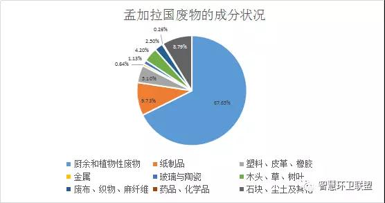 從圖表中可以看出,在孟加拉國的廢物中,有機成分占了很大的比例,超過了70%,導(dǎo)致廢物不僅含水量很高(超過50%),熱值也很低(小于1000千卡/千克)。
