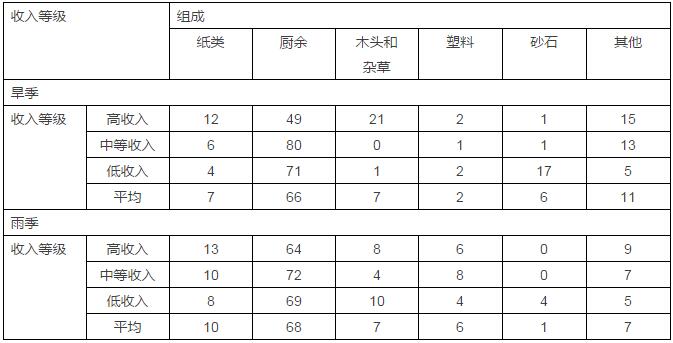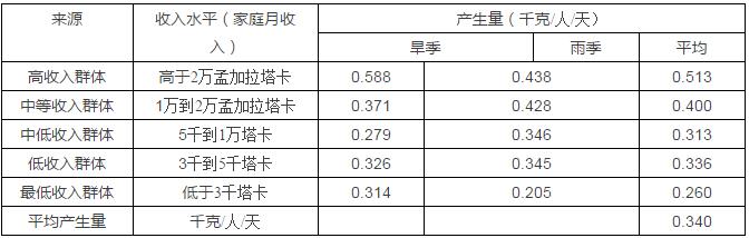 在達(dá)卡市,廢物的產(chǎn)生按重量計算,存在旱季和雨季的差別:在雨季,包括有機廢物在內(nèi)的各類能夠降解的廢物含有更多的水分,所以重量與旱季時相比會更大。此外,不同收入水平的人群廢物的產(chǎn)生量也存在極大的差異:收入最高人群的人均廢物產(chǎn)生量幾乎是收入最低人群的兩倍。