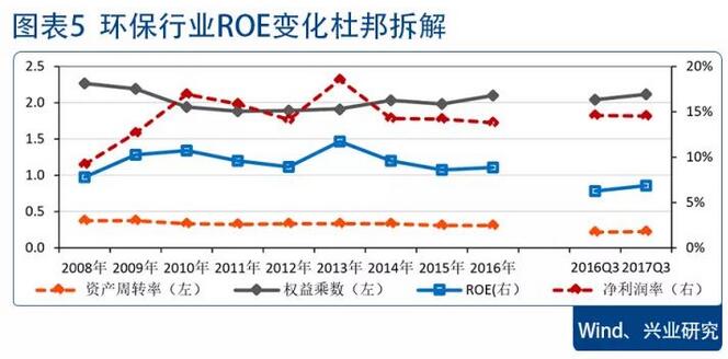 權(quán)益乘數(shù)抬升下,行業(yè)整體盈利能力小幅上升。2017年前三季度環(huán)保行業(yè)整體ROE為6.86%,同比增加0.61個(gè)百分點(diǎn)。通過(guò)杜邦分析來(lái)看,行業(yè)凈利率和資產(chǎn)周轉(zhuǎn)率整體保持穩(wěn)定,盈利能力的提升主要來(lái)自權(quán)益乘數(shù)的上升,隨著行業(yè)訂單的逐步釋放和PPP類訂單的增加,環(huán)保企業(yè)融資需求有所提升。