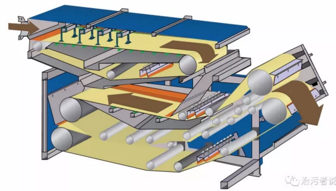 這是一個典型的濃縮壓濾一體機(jī)的構(gòu)造圖,從污泥濃縮壓濾一體機(jī)的結(jié)構(gòu)上來看,壓濾機(jī)分為三個部分,一部分是重力區(qū),在這個區(qū)間,主要是加了絮凝劑的污泥在污泥平攤輥的作用下,平攤到壓濾機(jī)上部平整的濾帶上,這部分濾帶沒有擠壓作用,僅僅是依靠加藥后的污泥和水分離開,水依靠重力作用通過濾帶流走的;第二部分進(jìn)入漸變區(qū),這個區(qū)域,開始有了第二條濾帶參與進(jìn)來,污泥開始進(jìn)入到一個上下兩條帶之間的位置,并逐漸受到上下兩條濾帶的包圍,并由寬變窄,形成一個漸變的區(qū)域,在這部分區(qū)域的污泥之間的水分在漸變的過程中得到一定的去除;第三部分進(jìn)入壓力區(qū),這部分濾帶上下開始強力擠壓,污泥中被絮凝藥劑剝離的顆粒之間的水分在壓力作用下從污泥中擠壓出去,通過濾帶流走。