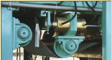 在脫水機(jī)的濾帶兩側(cè),各裝有一個限位開關(guān),和濾帶保持一定的距離,在濾帶碰觸到限位開關(guān)以后,限位開關(guān)給糾偏氣缸的空氣電動閥一個開啟信號,糾偏氣缸開始動作,推動糾偏輥子,濾帶在糾偏輥子的帶動下,回歸到正常的位置,完成一次完整的糾偏。帶式壓濾脫水機(jī)在運行中,不斷的進(jìn)行糾偏動作,對跑偏的濾帶進(jìn)行糾偏,從而保證了帶式壓濾機(jī)的正常穩(wěn)定的運行。