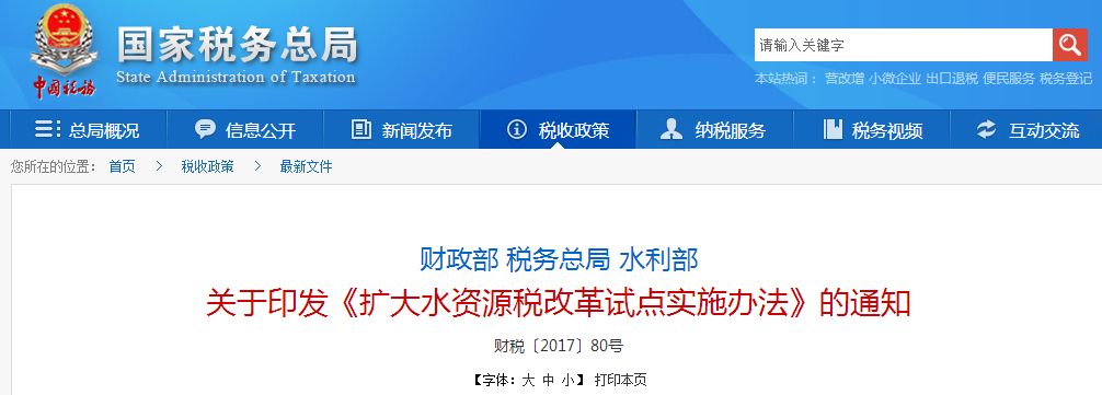 在國(guó)家稅務(wù)局獲悉關(guān)于印發(fā)《擴(kuò)大水資源稅改革試點(diǎn)實(shí)施辦法》的通知,全文如下: