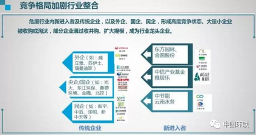 危廢市場(chǎng)格局是危廢行業(yè)內(nèi)新進(jìn)入者及傳統(tǒng)企業(yè),及外企、國企、民企,形成高度競(jìng)爭(zhēng)狀態(tài)。在環(huán)保調(diào)控力度加強(qiáng)的情況下,很多資本躍躍欲試,進(jìn)入危廢處置行業(yè),包括一些大型集團(tuán),房地產(chǎn)企業(yè),綠化企業(yè),或者投資機(jī)構(gòu)等。企業(yè)跑馬圈地和異地收購將會(huì)持續(xù)下去,搶占危廢市場(chǎng)或?qū)⒂萦?,大量小企業(yè)被收購或淘汰,部分企業(yè)通過收并購、擴(kuò)大規(guī)模,成為行業(yè)龍頭企業(yè)。
