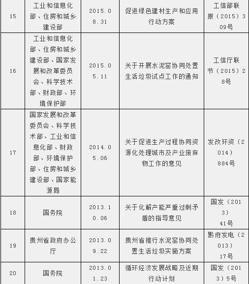 為促進(jìn)全社會對水泥窯協(xié)同處置廢物特點(diǎn)的認(rèn)識,近年來,中國建筑材料聯(lián)合會、中國水泥協(xié)會不斷向政府主管部門提出支持水泥窯協(xié)同處置生活垃圾的政策建議,全國人大代表和政協(xié)委員也不斷提出議案。在政府方面,貴州省政府敢于突破,2013年制定《貴州省推行水泥窯協(xié)同處置生活垃圾實(shí)施方案》,2014年5月,國家發(fā)改委等七部委發(fā)文《關(guān)于促進(jìn)生產(chǎn)過程協(xié)同資源化處理城市及產(chǎn)業(yè)廢棄物工作的意見》,2014年11月全國政協(xié)召開“雙周座談會”,俞正聲主席親自主持水泥窯協(xié)同處置廢棄物的專題討論,有關(guān)方面都參加了會議,形成基本共識,即水泥窯協(xié)同處置生活垃圾雖然是與垃圾焚燒發(fā)電競爭的對手,也是對生活垃圾焚燒發(fā)電的補(bǔ)充(例如在不宜發(fā)展垃圾發(fā)電的城市和地區(qū)),更是垃圾焚燒發(fā)電的好幫手(處置垃圾焚燒飛灰)。在各個方面的努力下,2015年5月,工業(yè)和信息化部等六部委發(fā)文《關(guān)于開展水泥窯協(xié)同處理生活垃圾試點(diǎn)工作的通知》(工信廳聯(lián)節(jié)[2015]第28號),進(jìn)一步確定了6家企業(yè)為水泥窯協(xié)同處置生活垃圾試點(diǎn)單位。工信部還確定了貴州省為水泥窯協(xié)同處置生活垃圾省級試點(diǎn)單位,2016年11月在貴州召開了現(xiàn)場工作會議。