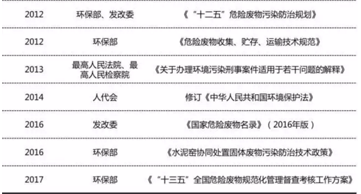 危廢政策不斷出臺(tái),尤其是省級(jí)細(xì)則落地:1)2017年環(huán)保部出臺(tái)“十三五”全國(guó)危險(xiǎn)廢物規(guī)范化管理督查考核工作方案,各省近期均推出省級(jí)危廢規(guī)范化管理督查方案;2)《國(guó)家危險(xiǎn)廢物名錄》自2016年8月1日起施行;新修訂的《固體廢物污染環(huán)境防治法》取消危險(xiǎn)廢物省內(nèi)轉(zhuǎn)移審批手續(xù);3)2016年最高司法機(jī)關(guān)就環(huán)境污染犯罪出臺(tái)專(zhuān)門(mén)司法解釋?zhuān)?)2018年起實(shí)施《環(huán)境保護(hù)稅法》,危廢稅額1000元/噸;5)環(huán)保部發(fā)布《水泥窯協(xié)同處置固體廢物污染防治技術(shù)政策》,支持水泥窯協(xié)同處置。