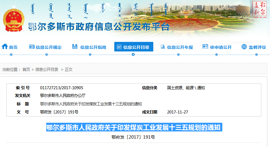 鄂爾多斯市人民政府關(guān)于印發(fā)煤炭工業(yè)發(fā)展十三五規(guī)劃的通知