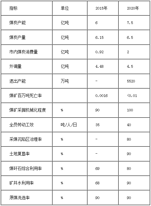 “十三五”期間,在滿足國內(nèi)煤炭市場需求,保障市內(nèi)煤電、煤化工原料煤炭供應(yīng)的前提下,到2020年,全市原煤產(chǎn)能控制在7.5億噸(預(yù)留1億噸市場調(diào)節(jié)產(chǎn)能);產(chǎn)量控制在6.5億噸左右。堅持推進煤炭綠色開采,采區(qū)回采率達到85%以上。推廣充填開采、保水開采和薄煤層開采等綠色開采技術(shù)。