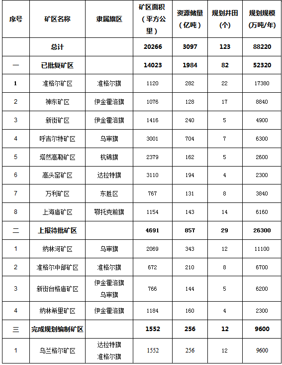 表1-1鄂爾多斯市規(guī)劃礦區(qū)基本情況表