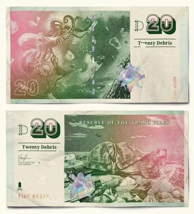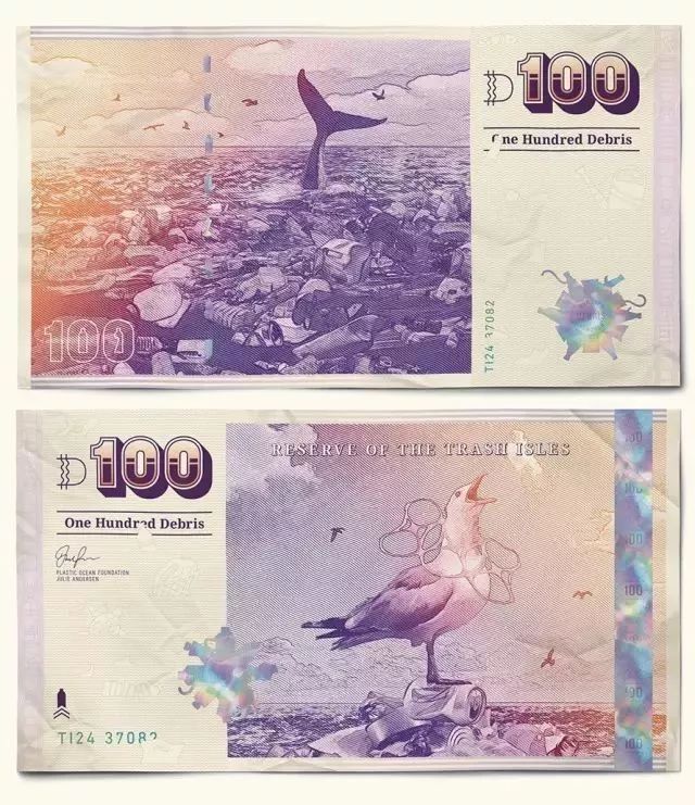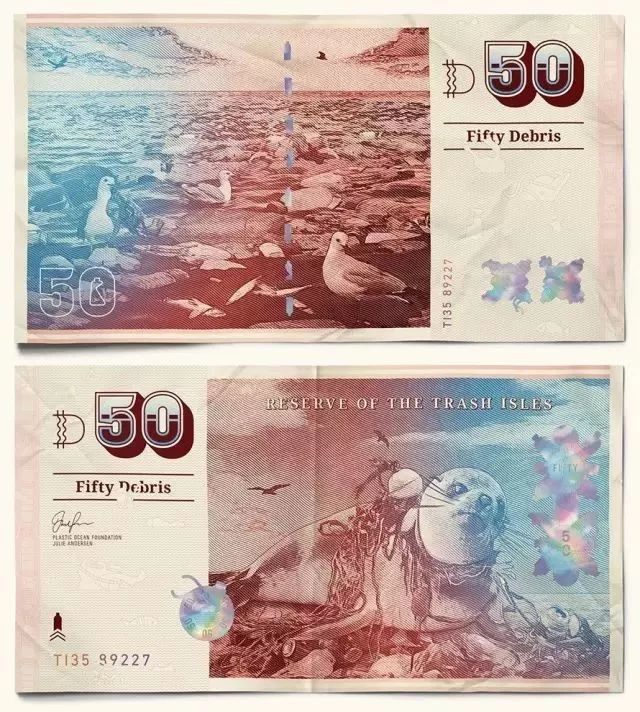 其他國(guó)家的貨幣都是領(lǐng)導(dǎo)人或風(fēng)景名勝,垃圾群島共和國(guó)的貨幣則獨(dú)樹一幟,均是動(dòng)物遭受海洋垃圾迫害的慘烈場(chǎng)景。