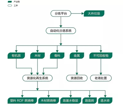 經(jīng)處理后的裝修垃圾主要分為成五大類,分別是:磚瓦等建筑廢棄物,一部分做成路基材料,一部分做成路面磚和透水磚;輕物質(zhì),塑料制品為主,可資源化利用做成塑料顆粒和RDF燃燒棒;木材,經(jīng)過加工處理變成燃燒棒;金屬物質(zhì),直接出售給資源回收企業(yè);有毒有害垃圾,移交有資質(zhì)的危費(fèi)處理企業(yè)。