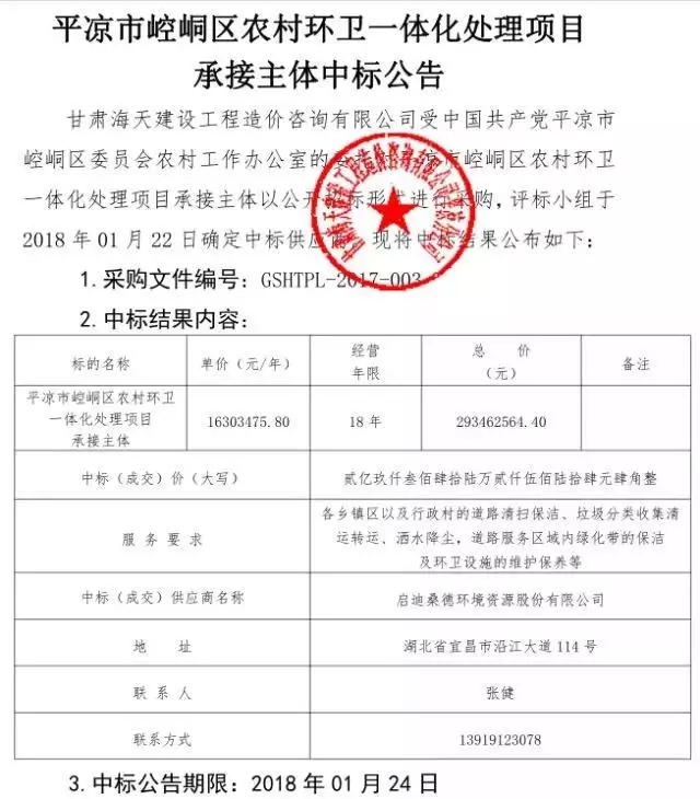 1月24日,據(jù)甘肅省政府采購網(wǎng)消息,桑德環(huán)衛(wèi)中標平?jīng)鍪嗅轻紖^(qū)農(nóng)村環(huán)衛(wèi)一體化處理項目包括各鄉(xiāng)鎮(zhèn)區(qū)以及行政村的道路清掃保潔、垃圾分類收集清運轉(zhuǎn)運、灑水降塵,道路服務區(qū)域內(nèi)綠化帶的保潔及環(huán)衛(wèi)設施的維護保養(yǎng)等,服務年限18年,中標總額293462564.40元。