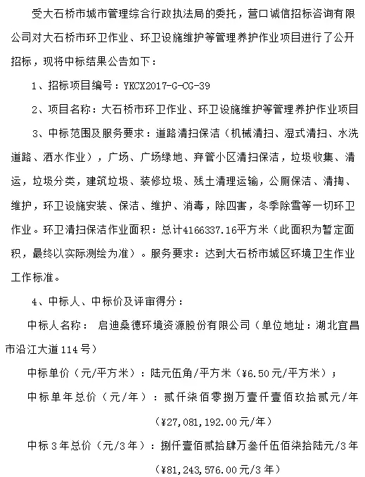 公告顯示,桑德環(huán)衛(wèi)中標大石橋市環(huán)衛(wèi)作業(yè)、環(huán)衛(wèi)設施維護等管理養(yǎng)護作業(yè)項目項目包括道路清掃保潔,廣場、廣場綠地、棄管小區(qū)清掃保潔,垃圾收集、清運,垃圾分類,建筑垃圾、裝修垃圾、殘土清理運輸,公廁保潔、清掏、維護,環(huán)衛(wèi)設施安裝、保潔、維護、消毒,除四害,冬季除雪等一切環(huán)衛(wèi)作業(yè)。服務年限3年,中標總額81243576元。