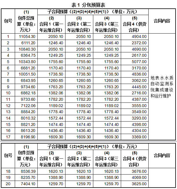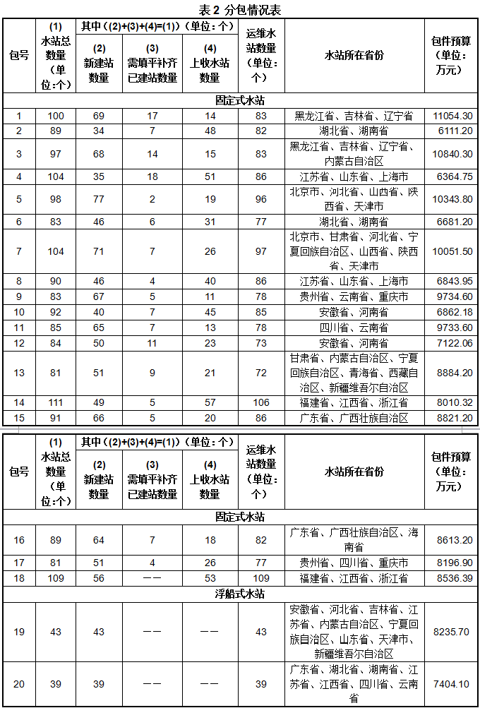 7. 招標(biāo)內(nèi)容為:招標(biāo)人計(jì)劃采購(gòu)1087個(gè)國(guó)家地表水自動(dòng)監(jiān)測(cè)站(以下簡(jiǎn)稱水站)的建設(shè)及其三年運(yùn)維服務(wù)、531個(gè)已建水站的三年運(yùn)維服務(wù)、135個(gè)國(guó)家已建水站的儀器設(shè)備填平補(bǔ)齊。其中,1~18包為固定式水站,19~20包為浮船式水站。具體要求詳見第四章技術(shù)需求書。
