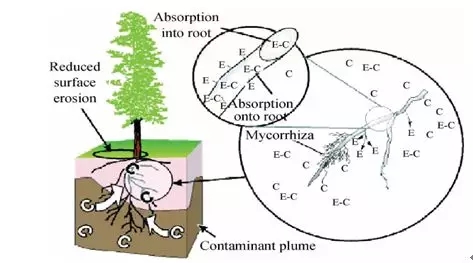 根際降解:根際降解本質(zhì)是植物根部輔助微生物降解。植物根部及其周圍微生物的相互作用,能夠顯著降低石油類污染物的毒性和持久性。首先,植物的非根部分能夠?yàn)楦刻峁┍匾臓I(yíng)養(yǎng)物質(zhì),促進(jìn)根的生長(zhǎng) ,并分泌有機(jī)物質(zhì),增加石油污染物的生物可利用性;其次,植物根部能夠創(chuàng)造富含糖類、氨基酸、有機(jī)酸、維生素 、單寧、生物堿、固醇、生物酶、生長(zhǎng)素等營(yíng)養(yǎng)物質(zhì)的多元有機(jī)環(huán)境,從而增強(qiáng)周邊微生物群落的新陳代謝活動(dòng); 最后,在根際微生物代謝作用下,將石油污染物降解為自身生長(zhǎng)必須的碳源,同時(shí)減少石油污染物對(duì)植物的毒害作用。