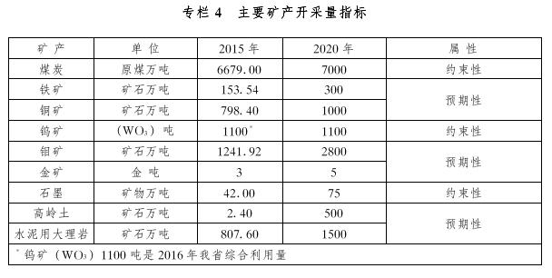 1.完善礦產(chǎn)資源開(kāi)發(fā)調(diào)控方向。鼓勵(lì)開(kāi)采鐵、銅、金、銀、高嶺土、礦泉水、地下熱水等礦產(chǎn),在資源條件好、環(huán)境承載力強(qiáng)、配套設(shè)施齊全、區(qū)位優(yōu)勢(shì)明顯的地區(qū),集中建設(shè)具有市場(chǎng)競(jìng)爭(zhēng)力的大中型礦山,提高礦產(chǎn)資源供給能力。限制開(kāi)采煤炭、鎢、石墨,規(guī)劃期間全省煤炭產(chǎn)能只減不增,除脫困安置替代項(xiàng)目外,暫停審批各類(lèi)煤礦新增產(chǎn)能項(xiàng)目。禁止開(kāi)采砂金、泥炭和可耕地磚瓦用粘土。