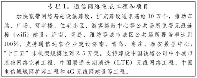 (一)強(qiáng)化項(xiàng)目帶動(dòng),提升產(chǎn)業(yè)規(guī)模組織實(shí)施重大基礎(chǔ)設(shè)施項(xiàng)目。積極推進(jìn)山東半島自主創(chuàng)新示范區(qū)、黃河三角洲國(guó)家農(nóng)業(yè)高新技術(shù)產(chǎn)業(yè)示范區(qū)建設(shè)。完善高技術(shù)產(chǎn)業(yè)基地、戰(zhàn)略性新興產(chǎn)業(yè)示范基地的基礎(chǔ)設(shè)施,提高產(chǎn)業(yè)承載能力。規(guī)劃建設(shè)山東省藍(lán)谷區(qū)域創(chuàng)新中心等一批省級(jí)區(qū)域創(chuàng)新中心,推進(jìn)區(qū)域創(chuàng)新資源的開放共享,打造形成特色優(yōu)勢(shì)顯著的“創(chuàng)新谷”。落實(shí)智慧城市、寬帶山東、大數(shù)據(jù)等重大戰(zhàn)略,推進(jìn)新一代網(wǎng)絡(luò)通訊、大數(shù)據(jù)中心等基礎(chǔ)設(shè)施建設(shè),提升支撐能力。