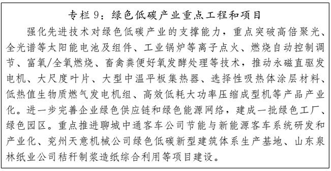 ?。┚G色低碳產(chǎn)業(yè)。順應(yīng)新能源技術(shù)應(yīng)用系統(tǒng)化、模塊化、分布式方向,優(yōu)化風(fēng)能、太陽能布局,推動(dòng)生物能的推廣應(yīng)用。把握全球新能源汽車輕量化、智能化的科技發(fā)展趨勢(shì),完善地方性標(biāo)準(zhǔn)規(guī)范和政策體系,推進(jìn)純電動(dòng)、混合動(dòng)力及低能耗汽車技術(shù)創(chuàng)新。加快節(jié)能環(huán)保制造業(yè)與服務(wù)業(yè)聯(lián)動(dòng)發(fā)展,促進(jìn)形成綠色產(chǎn)業(yè)結(jié)構(gòu)、綠色增長(zhǎng)方式和綠色消費(fèi)模式,助力“生態(tài)山東”和“綠色山東”建設(shè)。到2020年,建設(shè)30個(gè)循環(huán)經(jīng)濟(jì)示范基地、300個(gè)示范企業(yè),培育發(fā)展一批新能源和節(jié)能環(huán)保企業(yè)。