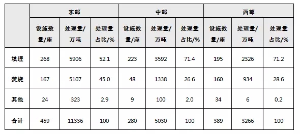 2016年我國東、中、西部城市生活垃圾不同無害化處置技術(shù)的比例