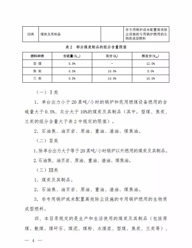 第Ⅰ類,考慮到中西部地區(qū)部分城市煤炭使用還存在規(guī)?;讲桓叩默F(xiàn)象,從鼓勵(lì)煤炭清潔利用角度,提出單臺出力小于20蒸噸/小時(shí)的鍋爐和民用燃煤設(shè)備燃用的含硫量大于0.5%、灰分大于10%的煤炭納入禁燃范圍。其中,型煤、焦炭、蘭炭的揮發(fā)分含量不能大于12%、5%和10%,對型煤的灰分含量沒有要求。