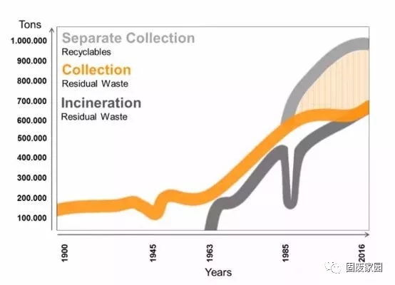 1960 年左右,二戰(zhàn)后的維也納經(jīng)濟復(fù)蘇,伴隨著人口增長,加上包裝行業(yè)新起,垃圾數(shù)量迅速增長。也是在那個時間段,維也納開始焚燒垃圾,并且在 1980 年代開始將垃圾區(qū)分為可回收和不可回收。此后垃圾數(shù)量有增無減,直到2016年才相對穩(wěn)定。
