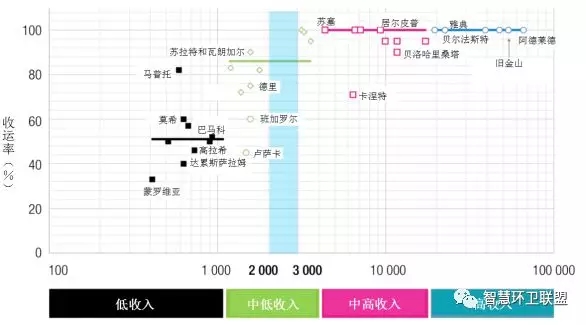 圖6展示了39作城市的收運率??梢钥闯?,圖中存在一個分水嶺,在其一側(cè),收入較低城市收運率會隨收入水平的提升而上升,但當(dāng)收入水平達到了一定的閾值后,收運率便開始接近100%,不會再受到收入水平的影響。如果將例外情況秘魯?shù)目厥腥コ?,那么閾值所在的人均年收入水平就會落?000~3000美元上。需要注意的是,圖中的數(shù)據(jù)展示的是一座城市的整體情況,但城市中一般卻都有著貧富差異的鴻溝,即便是在收運率低下的城市,位于市中心的富足城區(qū)也會擁有將近100%的收運率,而低收入和非法修建的城區(qū),則有可能完全不能得到收運服務(wù)。