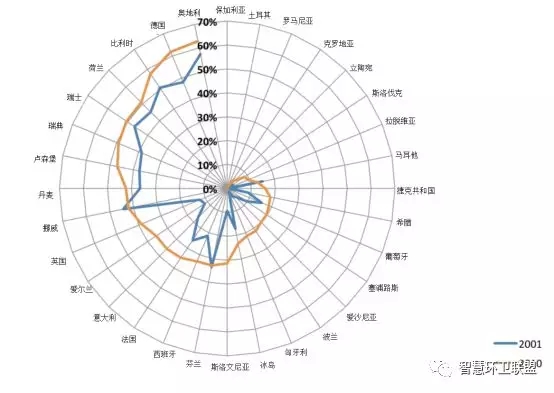 歐盟成員國會定期收集回收利用率的數(shù)據(jù),因此擁有系統(tǒng)的數(shù)據(jù)記錄,但即便如此,成員國對回收利用的定義卻也仍然存在差異——一些國家將以回收利用為目的進行收集的比例當(dāng)作回收利用率,一些國家則利用資源回收利用設(shè)施和堆肥設(shè)施的輸出作為計算的依據(jù);一些國家將焚燒發(fā)電廠最后排出的金屬和集料算入了回收利用率,另一些則將這一部分排除在外。圖9展示了歐盟各成員國在2001年和2011年時的回收利用率,可以看出,隨著回收利用率較低的成員國向著歐盟目標(biāo)的不斷努力,歐盟的總體回收利用率出現(xiàn)了十分明顯的提升。
