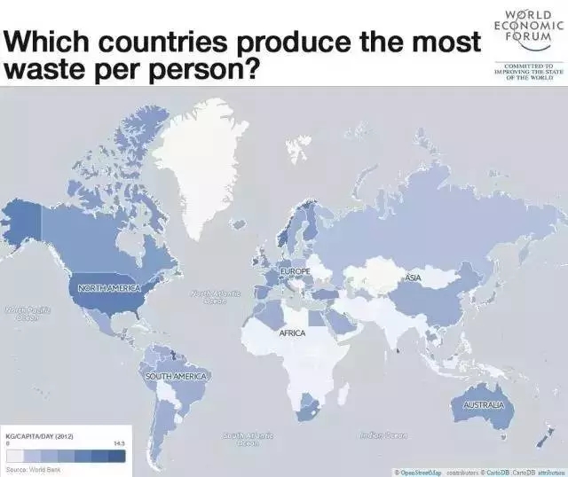 來自世界經(jīng)濟論壇的一張全球人均生產(chǎn)垃圾分布地圖顯示,人均垃圾生產(chǎn)量(單位:公斤/天)排名前五位的均為發(fā)達國家:新西蘭(3.68),愛爾蘭(3.58),挪威(2.8),瑞士(2.61),美國(2.58),而中國人均垃圾生產(chǎn)量基本維持在世界平均水平——1.2。