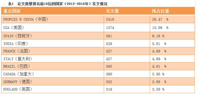 根據WOS檢索結果,全世界共有144國家或地區(qū)發(fā)表了土壤污染防治領域相關文獻。其中論文數量排名在前TOP10的國家(詳見表1)共發(fā)表了5760篇文獻,占總量的63.25%。我國在論文數量上占有絕對的優(yōu)勢,2012年—2016年共發(fā)表論文2410篇,位居榜首。