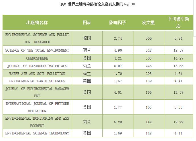 根據檢索結果,全球共有736種期刊發(fā)表了土壤污染防治領域的相關論文,該領域內發(fā)文量居前10位的期刊如下(表2)。這10種期刊的總發(fā)文量為1157篇,占總量比例為26.25%,平均影響因子3.485。其中,荷蘭占據4席,美國占據3席,英國占據2席,德國占據1席。并且,影響因子前三名也均屬荷蘭。發(fā)文最多的期刊是德國的《ENVIRONMENTALSCIENCEANDPOLLUTIONRESEARCH》,影響因子最高的期刊是荷蘭的《ENVIRONMENTALMONITORINGANDASSESSMENT》。由此可見,在土壤污染防治相關領域中,荷蘭期刊已達較高的學術水平。
