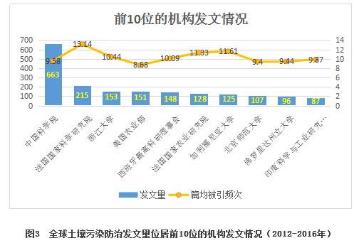 全球共有5420家科研機構或單位發(fā)表了土壤污染防治領域的文獻,發(fā)文量位居前10名的機構或單位以科研機構或者大學為主(見圖3),共發(fā)表1873篇文獻,占該領域發(fā)文總量的20.56%。這10家機構中,中國機構和美國機構數量最多,各有3個,法國的機構有2個,西班牙和印度機構各有1個。其中中國科學院是發(fā)文數最多的機構。