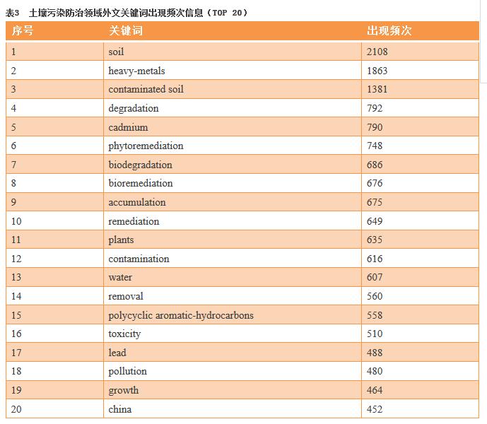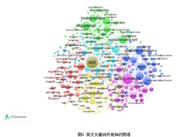 將webofscience上檢索到的9323條英文數據導入VOSviewer,共分析了491個關鍵詞,得出的高頻關鍵詞見表3。據統(tǒng)計,soil(土壤),heavy-metals(重金屬),出現頻次最高,可見重金屬的污染防治一直是領域的關注重點。degradation(退化)排名第四,反映出近5年來土壤退化問題備受關注。此外,植物修復和微生物修復也是近來的研究熱點。