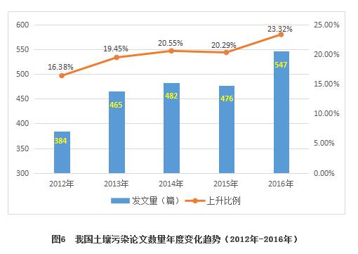 據統(tǒng)計,中國知網收錄的近5年土壤污染防治核心期刊文獻共2345篇,年度發(fā)文量總體呈上升趨勢(見圖6),上升率由2012年的16.38%升至2016年的23.32%,高出了6.94%,從年度論文數量的變化中可以看出我國學術界對土壤污染防治的關注度上升,說明我國科研人員越來越重視土壤污染防治的研究。