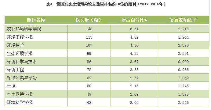 據統(tǒng)計,國內發(fā)表土壤污染防治論文數量排名前10位的期刊如表4所示?!掇r業(yè)環(huán)境科學學報》載文量最高,共148篇,占總發(fā)文量的6.31%;而《環(huán)境工程學報》以113篇的載文量,位居第二,其論文數量占總發(fā)文量的4.82%;《環(huán)境科學》以第二名6篇之差位列第三,共107篇,占總發(fā)文量的4.56%。