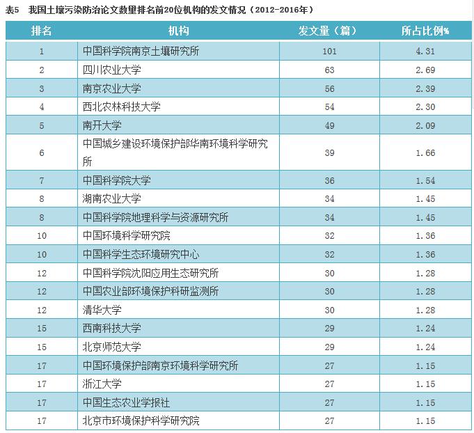 截至2016年發(fā)表的土壤污染防治相關研究論文中,發(fā)文量位居前20位的科研機構或單位見表5。中國科學院南京土壤研究所發(fā)文量101篇,以絕對性優(yōu)勢居榜首,四川農業(yè)大學以63篇發(fā)文居第二,南京農業(yè)大學以7篇之差位列第三。前20位的機構中,共有10所高校入圍,其中4所是農業(yè)類院校;科研機構有9個入圍。可見,高校和科研機構是我國研究土壤污染防治的主力軍。