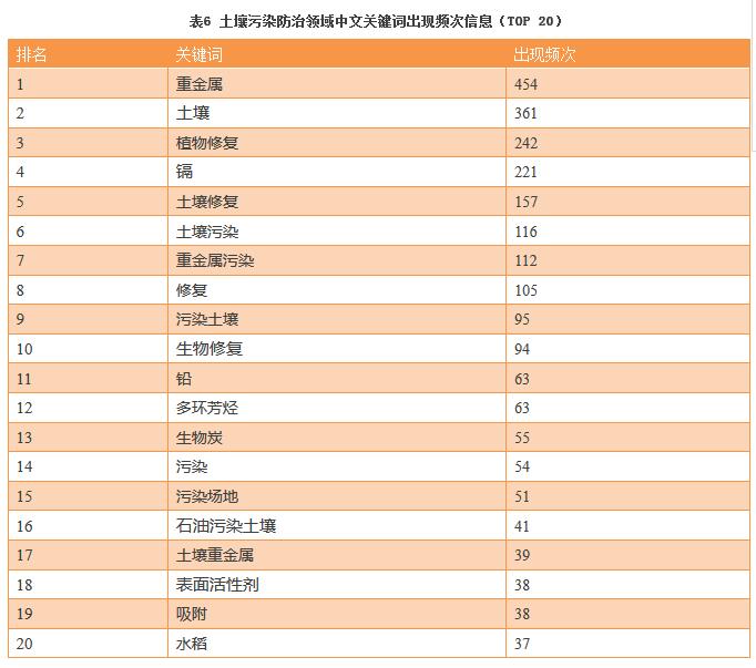 將中國知網收錄的近5年土壤污染防治核心期刊文獻2345篇導入VOSiewer,分析后得出的高頻關鍵詞見下表。由表6可見,出現頻次最高的是重金屬,出現了454次,遠遠高于其他關鍵詞,出現頻次排名第二和第三分別是土壤和植物修復。由此可見,我國在土壤污染防治研究領域,關注最多的是重金屬污染的植物修復與生物修復技術研究,與之前分析的國際研究熱點吻合。