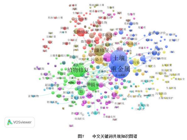 中文關鍵詞共現知識圖譜和熱點圖分別見圖7和圖8,可以發(fā)現該領域研究熱點集中在土壤重金屬防治技術研究,包括鎘、鉻、鋅、鉛、砷和汞及持久性有機污染物,特別是多環(huán)芳烴等的防治技術研究。在包含植物修復與微生物修復的生物修復技術研究方面熱度較高。