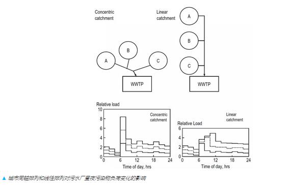 Gujer教授提醒我們污水處理系統(tǒng)除了污水處理廠之外,管網(wǎng)也是其重要的組成。污水廠的進(jìn)水負(fù)荷變化在某程度是由于污染物進(jìn)入管網(wǎng)時(shí)間的差異,以及管網(wǎng)分布的長(zhǎng)度造成的,這兩個(gè)因素都跟時(shí)間這個(gè)變量有關(guān)。Gujer教授用下圖闡述了同軸排列和線性排列兩種排放模式的區(qū)別——前者的負(fù)荷變化更大,而后者的收集方式能使進(jìn)水水質(zhì)更穩(wěn)定。由于晝夜負(fù)荷變化很大程度上控制了生物處理過程中的硝化性能,所以使用后者的城市規(guī)劃模式對(duì)該地區(qū)的污水處理是有好處的。