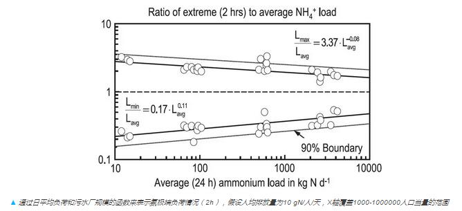 下圖總結(jié)了不同污水收集方式下氨的極端負(fù)荷和日平均負(fù)荷的比值。由于硝化處理設(shè)計(jì)的安全系數(shù)通常按照最大負(fù)荷和平均負(fù)荷的比值來設(shè)定,因此該圖能提供重要的設(shè)計(jì)信息。根據(jù)此圖,我們會(huì)發(fā)現(xiàn)安全系數(shù)的選定是個(gè)很有趣的事情——安全系數(shù)(也就是相應(yīng)的SRT)設(shè)定越大,污水廠的處理能力就變小,因此專業(yè)性就降低,而且更加難以運(yùn)行。